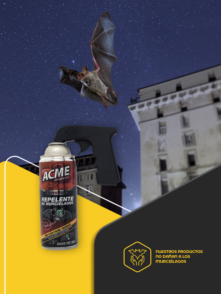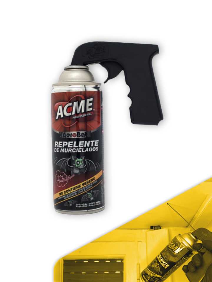 Aerobat es un práctico y seguro aerosol, que permite ahuyentar murciélagos, de manera fácil, segura y efectiva en espacios reducidos. La formulación de Aerobat no daña a los murciélagos, y es segura para el medio ambiente. AeroBat contiene un modificador de conducta que actúa como repulsivo (expulsivo de acción inmediata) y repelente (preventivo residual) de murciélagos, basándose en una acción netamente física de exclusión. Aerobat es ideal para repeler murciélagos presentes en taparrollos, vacíos estructurales (paredes huecas), techos de tejas o cualquier otro sitios reducidos donde se observe la presencia de los mismos.